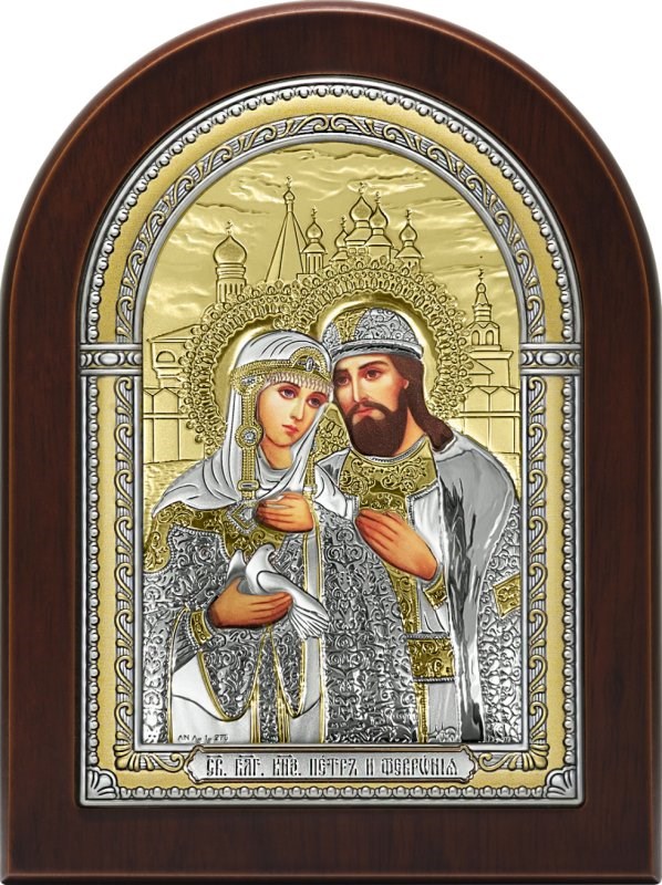 Эта икона словно приносит в дом тихую радость — ту, что живёт в простых вещах: в утреннем чае вдвоём, в негромком разговоре перед сном, в руке, которую не нужно искать. Пётр и Феврония смотрят с образа спокойно, без пафоса — двое людей, которые прошли через всё и остались вместе. На серебристом окладе тонким золотым узором проступают купола — словно память о Муромской земле, где они правили и где их помнят до сих пор.