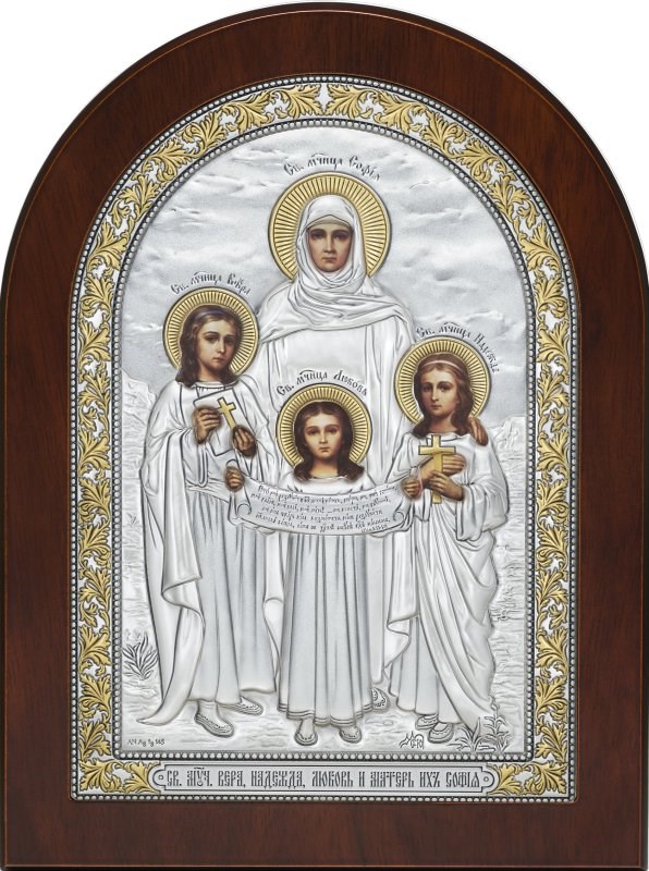 Четыре белых силуэта на серебре — мать и три дочери, совсем юные, с золотыми нимбами над головами. София стоит за девочками, словно обнимая их взглядом, а они держат кресты в руках — три сестры, которые приняли мученичество на глазах матери. Вера, Надежда, Любовь — сами имена звучат как молитва, и история их почитания всегда была особенной: к ним обращаются матери, которые молятся о детях, о силе перенести любую скорбь, о том, чтобы хватило любви на всё.