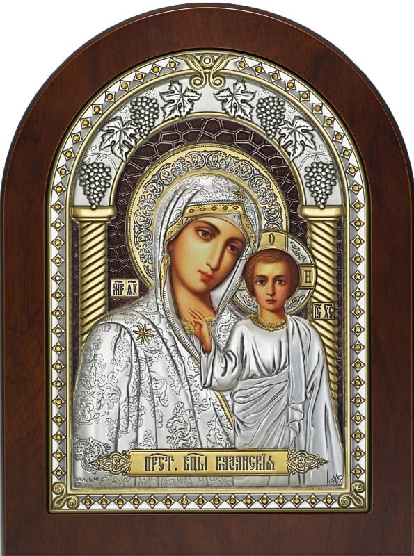 Основа - Коричневое дерево ; арочная форма;Размер: 120 х 162 см; Оклад покрыт серебром 999 пробы; полноразмерное изображение под окладом; золотой лак; цветной коричневый лак по фону; жёлтые стразы;