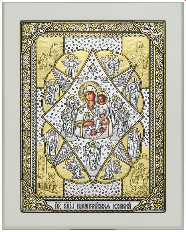 Икона освященная Неопалимая Купина Божией Матери серебряная на белом дереве позолоченная, арт. 243125