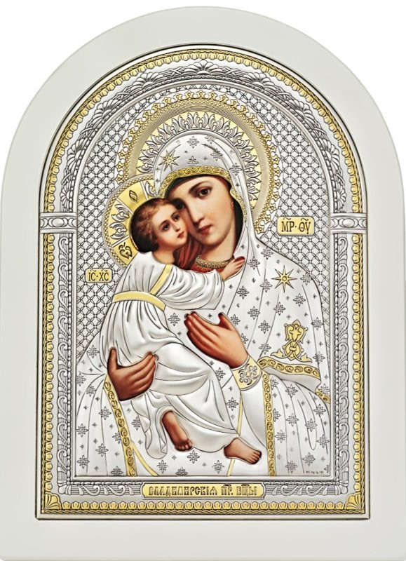 Икона серебряная Владимирской Божьей Матери на белом дереве позолоченная, арт. 243489