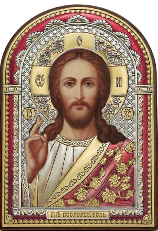 Подарочная икона серебряная Господь Вседержитель на коричневом дереве, арт. 243594