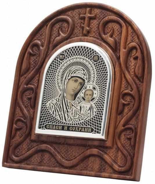 Это православное изделие - Икона выполнено из серебра 960 пробы. В изделии также присутствуют элементы из дерева и обсидиана. в форме арки. Икона имеет нанесённый лик - Икона Казанская Богоматерь. Изделие входит в коллекцию "Обсидиан".