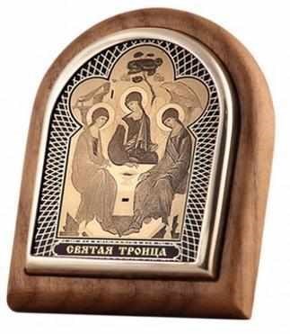 Это православное изделие - Икона выполнено из серебра 960 пробы. В изделии также присутствуют элементы из дерева и обсидиана. в форме арки. Икона имеет нанесённый лик - Троица. Изделие входит в коллекцию "Обсидиан".