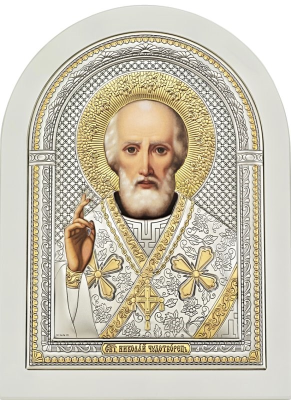 Подарочная освященная икона Николая Чудотворца на белом дереве серебряная позолоченная, арт. 243653