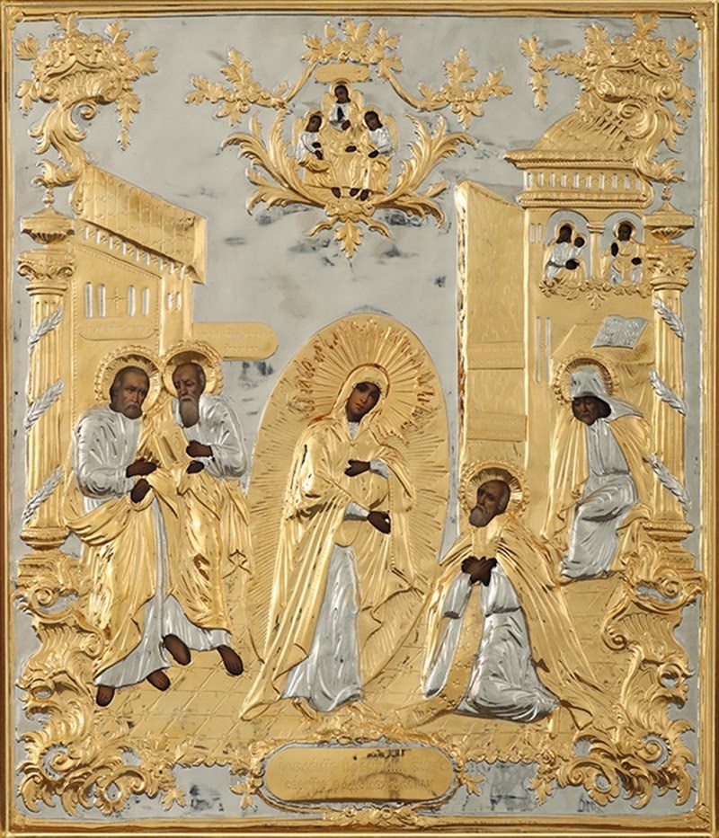 Икона живописная в ризе 30х40 объемная золочение Явление Богородицы С.Радонежскому, арт. 237452