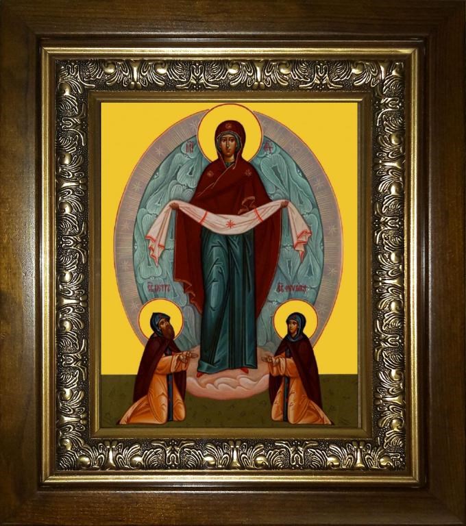 Покров Пресвятой Богородицы с препадающими святыми Петром и Февронией Муромскими Покров Пресвятой Богородицы 18х24 в киоте 24х30, арт. km_25_2473