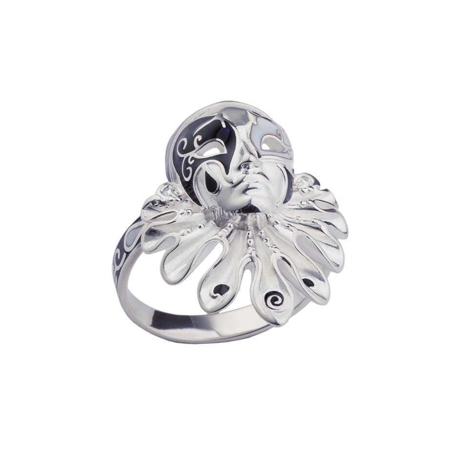 Кольцо «Маска Пьеро» выполнено из серебра 925 пробы по технологии горячего эмалирования.
