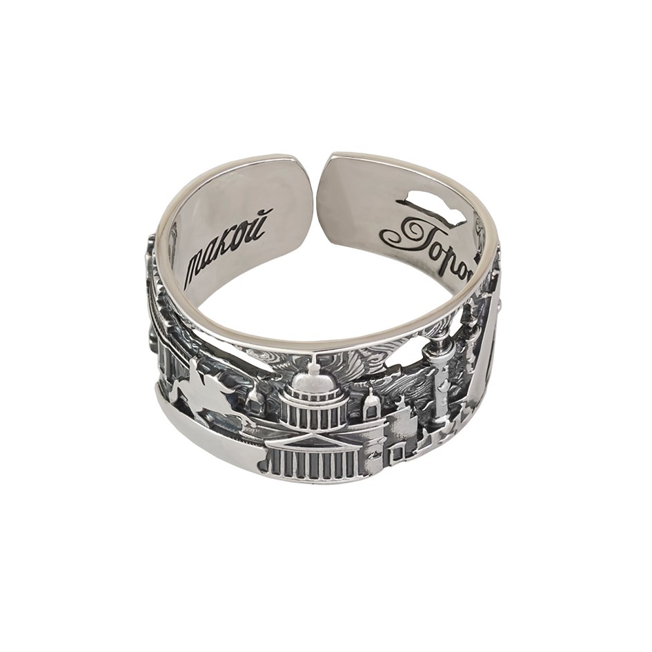 Кольцо «Весь Петербург», выполненное из серебра 925*, вместило в себя все главные достопримечательности Петербурга. Украшение является безразмерным и подходит как для женщин, так и для мужчин.