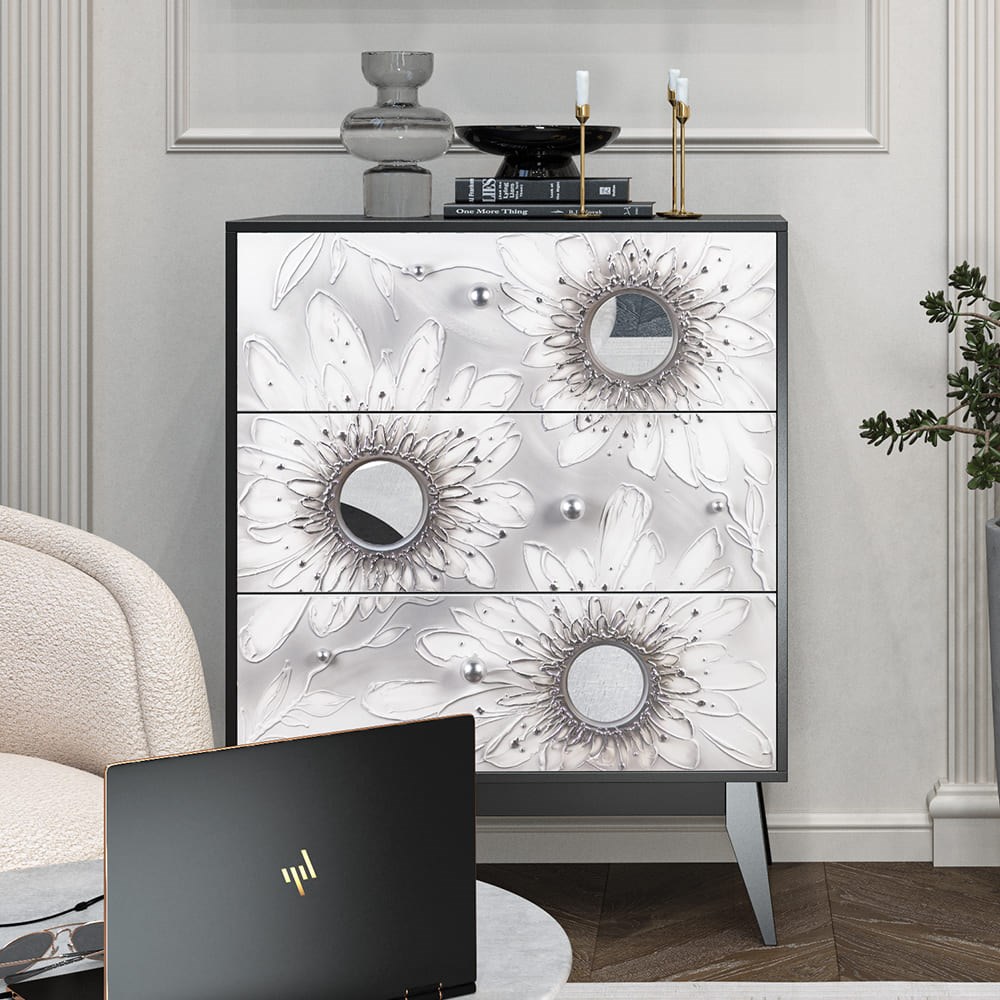Комод из МДФ с тремя выдвижными ящиками. Комод BOGACHO - это образ современности вне времени. Конические ножки и прочный каркас выполнены из МДФ, декоративные элементы изготовлены из мраморной пудры и легированной стали, отшлифованы и патинированы вручную/дополнены зеркальными деталями. Комод имеет три выдвижных ящика и доставляется в собранном виде. Добавьте в интерьер своего пространства уюта и атмосферу гармонии вместе с эксклюзивными изделиями BOGACHO.