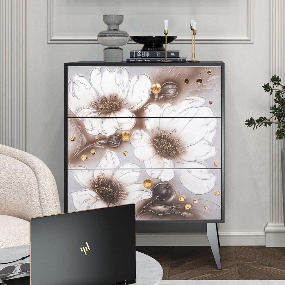Комод из МДФ с тремя выдвижными ящиками. Комод BOGACHO - это образ современности вне времени. Конические ножки и прочный каркас выполнены из МДФ, декоративные элементы изготовлены из мраморной пудры и легированной стали, отшлифованы и патинированы вручную. Комод имеет три выдвижных ящика и доставляется в собранном виде. Добавьте в интерьер своего пространства уюта и атмосферу гармонии вместе с эксклюзивными изделиями BOGACHO.