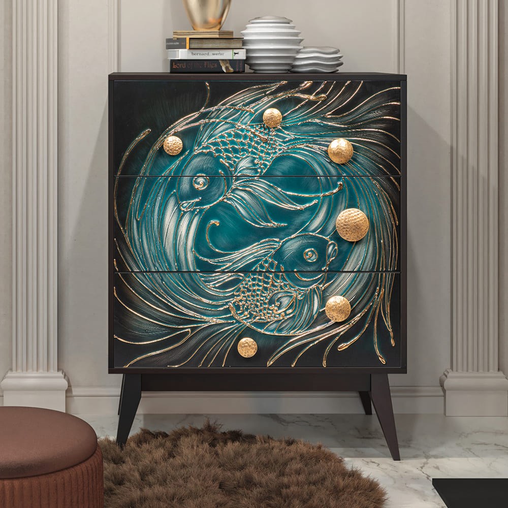 Комод из МДФ с тремя выдвижными ящиками. Комод BOGACHO - это образ современности вне времени. Конические ножки и прочный каркас выполнены из МДФ, декоративные элементы изготовлены из мраморной пудры и легированной стали, отшлифованы и патинированы вручную. Комод имеет три выдвижных ящика и доставляется в собранном виде. Добавьте в интерьер своего пространства уюта и атмосферу гармонии вместе с эксклюзивными изделиями BOGACHO.