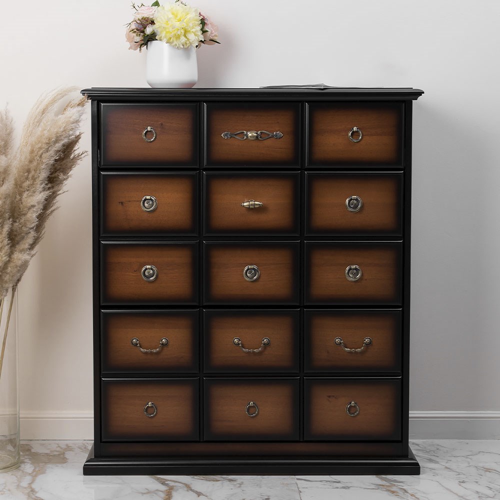 Комод с 2-мя широкими и одним узким выдвижным ящиком. Изделие отличается прочной устойчивой конструкцией и прослужит не один год! Материалы изготовления и размеры изделия Каркас комода и ящики выполнены из МДФ. Поверхность тонирована, патинирована и покрыта лаком. Ящики выполнены из МДФ и окрашены в синий, белый и красный цвета. Фурнитура из латуни испанского производства.