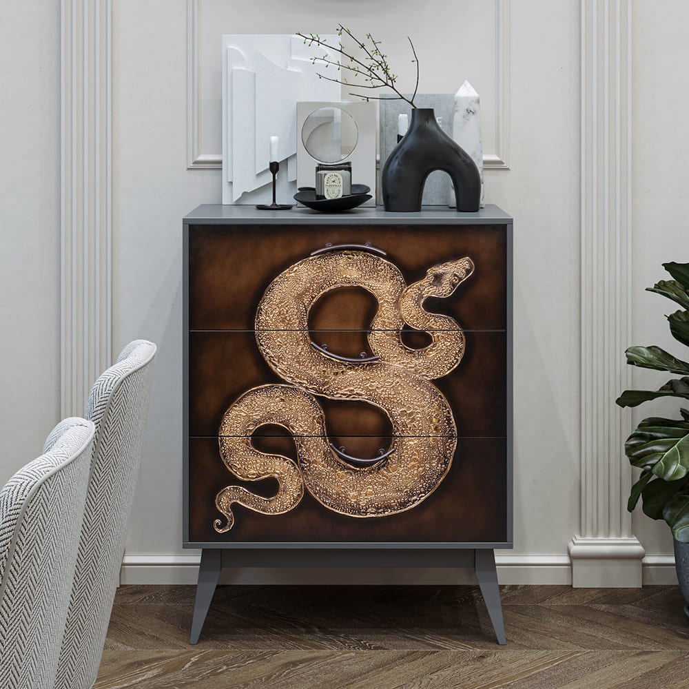 Комод из МДФ с тремя выдвижными ящиками. Комод BOGACHO - это образ современности вне времени. Конические ножки и прочный каркас выполнены из МДФ, декоративные элементы изготовлены из мраморной пудры и легированной стали, отшлифованы и патинированы вручную. Комод имеет три выдвижных ящика и доставляется в собранном виде. Добавьте в интерьер своего пространства уюта и атмосферу гармонии вместе с эксклюзивными изделиями BOGACHO.