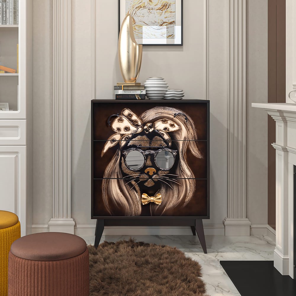 Комод BOGACHO Собака Микаэла коричневый из коллекции Фьюжин – это образ современности вне времени. Конические ножки и прочный каркас выполнены из МДФ, декоративные элементы изготовлены вручную из мраморной пудры и легированной стали вручную. Комод имеет три выдвижных ящика и доставляется в собранном виде. Добавьте в интерьер своего пространства уюта и атмосферу гармонии вместе с эксклюзивными изделиями BOGACHO.