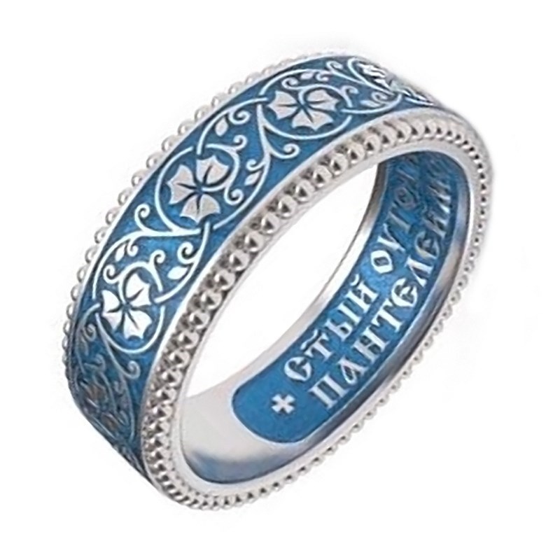 Это православное изделие - Кольцо выполнено из серебра 925 пробы. Поверхность изделия сначала вручную покрывается горячей эмалью а затем стойкость цвета закрепляется родированием. На изделии начертаны фрагменты молитвы "Св угодниче Божий целебниче Пантелеимоне моли". Изделие входит в коллекцию "Кипрей".