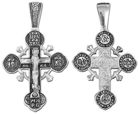 Это православное изделие - Крест выполнено методом литья из серебра 925 пробы. Поверхность изделия покрыта методом чернения (оксидирования). Изделие входит в коллекцию "Санкт - Петербург".