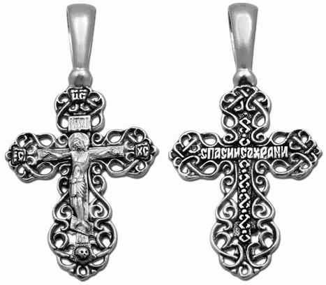 Красивый освященный крестик из серебра 925*, покрытый чернением, будет ценным подарком любому верующему человеку, имеет государственную ювелирную бирку, что гарантирует долгую службу.