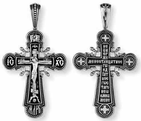 Это православное изделие - Крест выполнено методом литья из серебра 925 пробы. Поверхность изделия покрыта методом чернения (оксидирования). На изделии начертаны фрагменты молитвы "Не отвержи мене от лица Твоего и Духа Твоего Свято". Изделие входит в коллекцию "Санкт - Петербург".