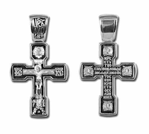 Это православное изделие - Крест выполнено методом литья из серебра 925 пробы. Поверхность изделия покрыта методом чернения (оксидирования). На изделии начертаны фрагменты молитвы "Кресту твоему поклоняемся Владыко и святое воскр". Изделие входит в коллекцию "Санкт - Петербург".