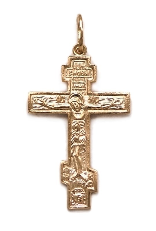 Это православное изделие - Крест выполнено методом штамповки из серебра 925 пробы. Поверхность изделия покрыта красной позолотой 585 пробы. Изделие входит в коллекцию "Традиция".