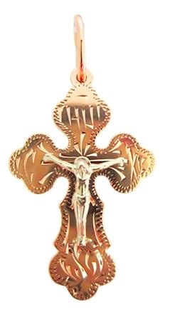 Добротный освященный крестик из серебра 925*, покрытый красной позолотой 585*, обладает безупречной эстетикой; мы поможем подобрать подходящий комплект к изделию.