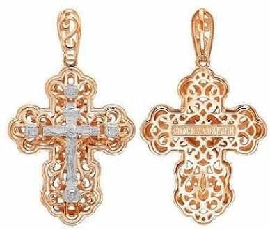 Это православное изделие - Крест выполнено из серебра 925 пробы. Поверхность изделия покрыта красной позолотой 585 пробы. На изделии начертаны фрагменты молитвы "Спаси и сохрани". Изделие входит в коллекцию "Аксиос".