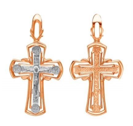 Это православное изделие - Крест выполнено из серебра 925 пробы. Поверхность изделия покрыта красной позолотой 585 пробы. На изделии начертаны фрагменты молитвы "Спаси и сохрани". Изделие входит в коллекцию "Аксиос".