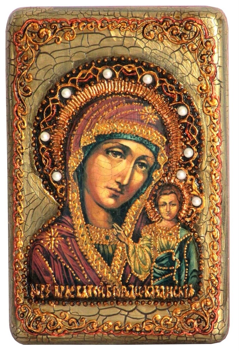 Образ Казанской Божьей Матери. Погрудное изображение Матери Божией и Христа, относится к типу «Одигитрия», т. е. «Путеводительница». Правая рука Богомладенца простерта в благословляющем жесте. Богоматерь указывает на Своего Сына как на путь спасения не рукой, но легким наклоном головы. Достоинством образа является крупный план, позволяющий в деталях рассмотреть божественные лики Богоматери и Христа. Икона чудесно явилась в 1579 году в Казани на пожарище дома стрельца Онучина. Чудеса от иконы начались ещё при её перенесении с места явления в храм: исцелились двое слепых. В 1579 году список с Казанской иконы отправлен в Москву царю Ивану Грозному. При Петре I один из списков чудотворной иконы был перенёсен в Санкт-Петербург. Ещё один чудотворный список с иконы был привезён из Казани в войско князя Дмитрия Пожарского в 1611 году. В честь освобождения Москвы от поляков были заложены храмы в честь Казанской иконы в Москве и Нижнем Новгороде. Нижегородская церковь не сохранилась, но вновь заложена на историческом месте в 2005 году, и скоро будет освящена. Казанской иконе молятся в болезнях глаз, о прозрении слепых, об избавлении от нашествия врагов, о помощи и заступлении в тяжелые времена; ею чаще всего благословляют вступающих в брак. Икона выполнена на натуральной деревянной доске, изготовленной из массива мореного дуба. Образ откопирован с авторского списка методом. получившим одобрение русской православной церкви. При окончательном оформлении образа исользовались специальные фронтажные грунты, выравнивающие лаки и темперные краски. Венец и поля иконы вручную украшены рельефным орнаментом и натуральным жемчугом. К каждой иконе прилагается номерное свидетельство с полной информацией о ней. Каждая икона поставляется в подарочной шкатулке.
