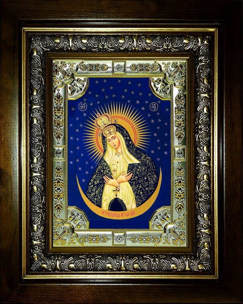 Икона выполнена на дереве профессиональными красками в технике шелкография на сусальном золоте. Лик "Остробрамская Божья Матерь" покрыт тремя слоями лакачто гарантирует долговечность и защиту изображения. Икона представлена в размере 18х24 сантиметра. Итальянский оклад изготовлен по уникальной технологии из металлической основы и покрыт серебром 925 пробы и золотом 585 пробычто подтверждено производственным клеймом. С тыльной стороны иконы прикреплен сертификат о соответствии. Икона бережно упакована в глянцевую коробку с православной символикой.