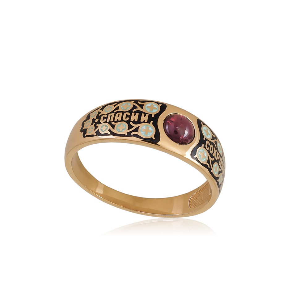 Перстень «Спаси и сохрани» выполнен в серебре 925* с золочением 999* по технологии горячего эмалирования, вставки – гранат.