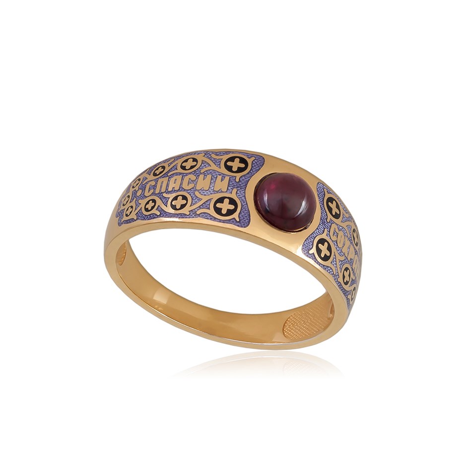 Перстень «Спаси и сохрани» выполнен в серебре 925* с золочением 999* по технологии горячего эмалирования, вставки – гранат.