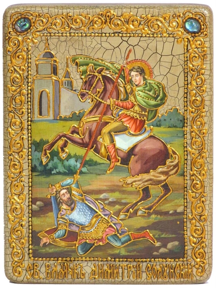 Подарочная икона "Чудо вмч. Димитрия Солунского о царе Калояне" на мореном дубе 15х20 полуаналойная, арт. RTI-235-5.m