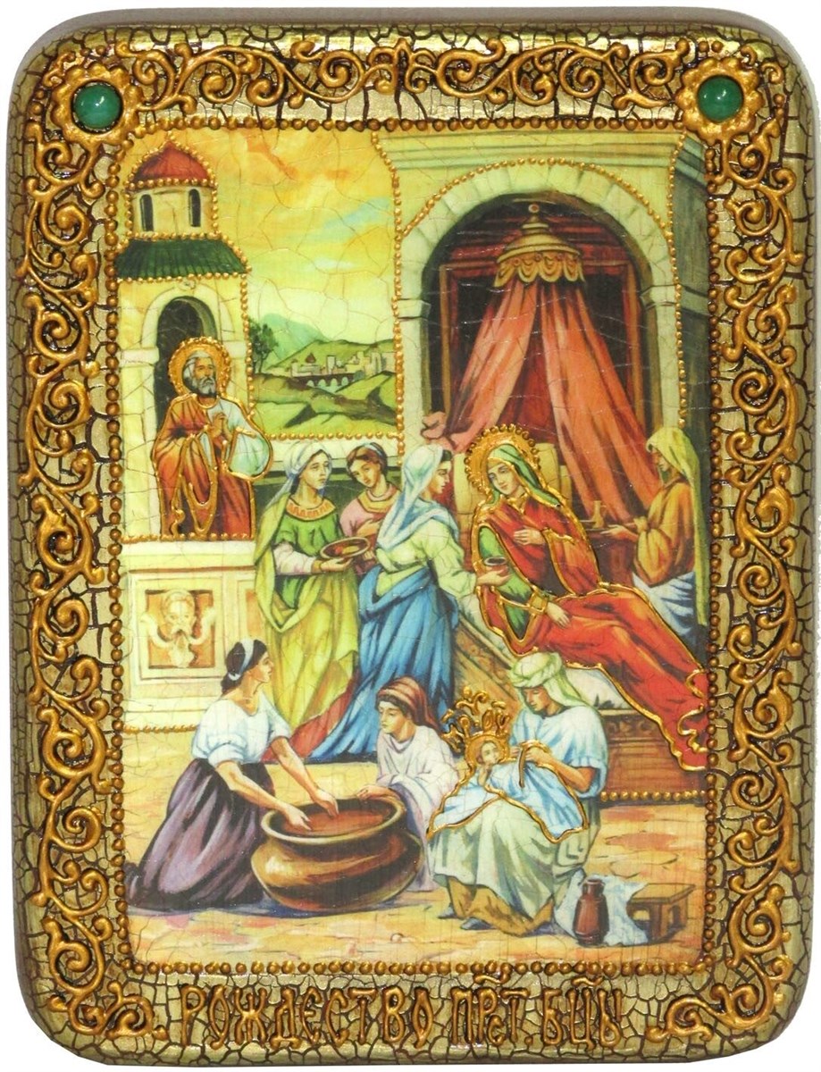 Согласно церковному Преданию, Пресвятая Дева Мария родилась в небольшом галилейском городе Назарете. Родителями Её были праведные Иоаким и Анна. Супруги были бездетны, но не теряли надежды, что Господь может разрешить неплодство Анны даже в её преклонном возрасте. Они горячо молились и просили Господа даровать им дитя, которое обещали посвятить Богу для служения в храме. И Господь услышал их молитвы: Праведная Анна зачала и разрешилась дочерью Марией – будущей Пресвятой Богородицей. Икона выполнена на натуральной деревянной доске, изготовленной из массива мореного дуба. При окончательном оформлении образа использовались специальные фронтажные грунты, выравнивающие лаки и темперные краски. Венец и поля иконы вручную украшены рельефным орнаментом. К каждой иконе прилагается номерное свидетельство с полной информацией о ней.
