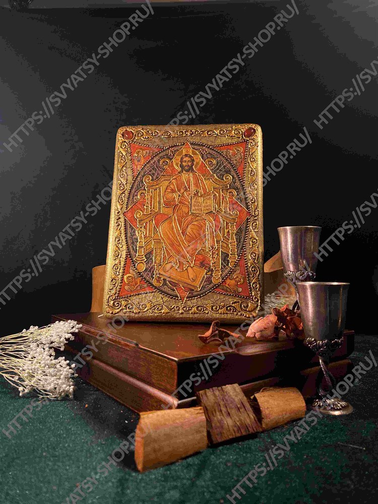 Спас в силах - центральное изображение в иконостасе православного храма. Эта икона имеет много общего с "Пантократором" и "Спасом на престоле", но отличается более сложной символикой. Христос, в хитоне и гиматии сидящий на престоле с книгой, изображен на фоне красного квадрата с вытянутыми концами. Квадрат - это символ земли. По четырем концам квадрата можно найти изображения ангела (человека), льва, тельца и орла. Это символы евангелистов (соответственно Матфея, Марка, Луки и Иоанна), разносящих спасительное учение во все концы света. Поверх красного квадрата написан синий овал - мир духовный. В синем овале изображены ангелы - силы небесные (отсюда название). Поверх синего овала - красный ромб (символ мира невидимого). Эта икона Спаса - настоящий богословский трактат в красках. Иконография иконы опирается в основном на Откровение Иоанна Богослова; образ показывает Христа таким, каким Он явится в конце времен. Икона выполнена на натуральной деревянной доске, изготовленной из массива мореного дуба. Образ откопирован с авторского списка методом. получившим одобрение русской православной церкви. При окончательном оформлении образа использовались специальные фронтажные грунты, выравнивающие лаки и темперные краски. Венец и поля иконы вручную украшены рельефным орнаментом и натуральным жемчугом. К каждой иконе прилагается номерное свидетельство с полной информацией о ней. Каждая икона поставляется в подарочной шкатулке.