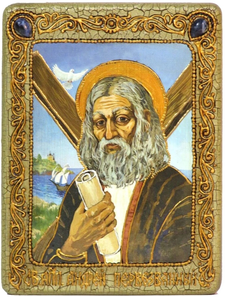 Подарочная икона "Святой апостол Андрей Первозванный" на черном дубе 15х20 полуаналойная, арт. RTI-238-8.m