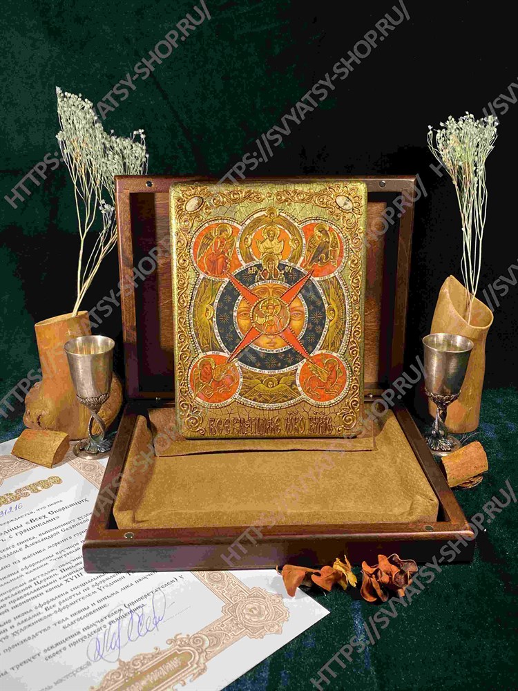 Среди христианских икон есть известные, особо популярные в народе, а есть и редкие. Но сила их от этого не только не меньше - по своему могуществу такие образа превосходят даже самые известные и намоленные. Икона «Всевидящее Око» довольно загадочна и не очень понятна обычному верующему человеку. Объясняется это сложным её рисунком, метафоричность и символическое значение которого требуют специального пояснения. В основе сюжета образа лежат библейские пророческие слова о недремлющем Божьем глазе, который надзирает над грешными, Его боящимися, и над теми христианами, которые уповают на Его милость и всепрощение. По сути, икона «Всевидящее Око» в аллегорической форме изображает мироздание с точки зрения христианской идеологии. В ней переданы сущность и самого Господа, и Духа Святого, и Богородицы, и Иисуса. Поэтому образ является всеобъемлющим, глобальным. И если для других икон существуют специальные молитвы, акафисты, через которые следует обращаться за помощью к высшим силам, то икона «Всевидящее Око» универсальна по сути. Перед нею можно молиться, как подсказывает сердце, как лежит душа, обо всём, что наболело. Богомольцы в любой ситуации обращаются к Богу, который надзирает над миром с высоты, всё ведает, над всем наблюдает, во всё вникает. Нет предела знаниям, и даже самый потаённый уголок сердца открыт для глаз Божьих и понятен совершенно. Икона «Всевидящее Око» отражает то идеальное мироустройство, которое должно быть установлено в царстве Божьем. В самом верху изображения находится Христос. Поднятая его рука застыла в благословляющем жесте. Образ Господа заключён в круг, как в Солнце. Усиливают сравнение и расходящиеся лучи. В этом плане икона «Всевидящее Око» значение имеет следующее: Господь - солнце, освещающее и согревающее мир, изливающее на него благодать свою. Далее идёт второй круг, в котором изображены людские лица, - они олицетворяют то самое человечество, на которое Благодать направлена. В третьем круге находится Богородица, молитвенно сложившая руки. В народе, в богословии она олицетворяет заступницу всех страждущих перед строгим судом Божьим. И, наконец, круг четвёртый - икона «Всевидящее Око Божие» содержит и его. Это идейно-смысловой центр композиции. Тут находится сам Спаситель, окружённый ангелами на фоне звёзд - воплощение высшей чистоты и духовности, истины в чистом виде. Оказаться там, рядом с Богом - значит, пройти до конца весь путь испытаний. Господь - начало всего, источник жизни физической и духовной. Христос - свет правды, а Мать Божья - кроткая заступница всего человеческого рода. Таков сакральный смысл образа. Списков иконы «Всевидящее око» существует множество, это знают те, кто прибегает к её помощи. При любой беде, нужде, проблеме можно обращаться к иконе. Плохое самочувствие, недоразумения с родными, на работе, улаживание конфликтных ситуаций и многие другие невзгоды позволяет наладить икона. Естественно, молитвы должны быть искренними, горячими, страстными, душевными. Икона выполнена на натуральной деревянной доске, изготовленной из массива мореного дуба. Образ откопирован с авторского списка методом. получившим одобрение русской православной церкви. При окончательном оформлении образа использовались специальные фронтажные грунты, выравнивающие лаки и темперные краски. Венец и поля 