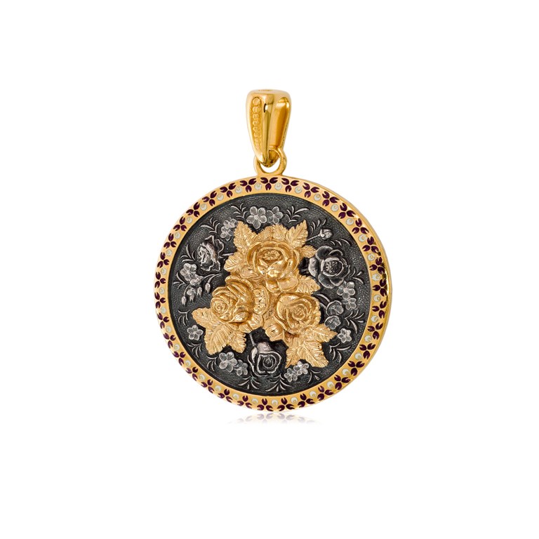 Подвеска из серебра круглая «Жостово» (золочение), с позолоченными розами и фиолетовым ободком, горячая эмаль