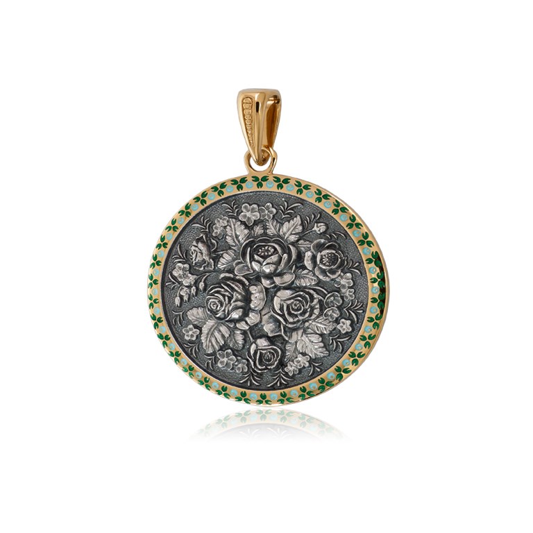 Подвеска выполнена из серебра 925-й пробы с чернением, покрыта золочением 999-й пробы по технологии горячего эмалирования.