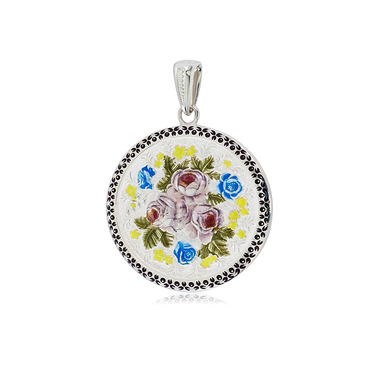Подвеска из серебра круглая «Жостовский букет» (эмаль), белая