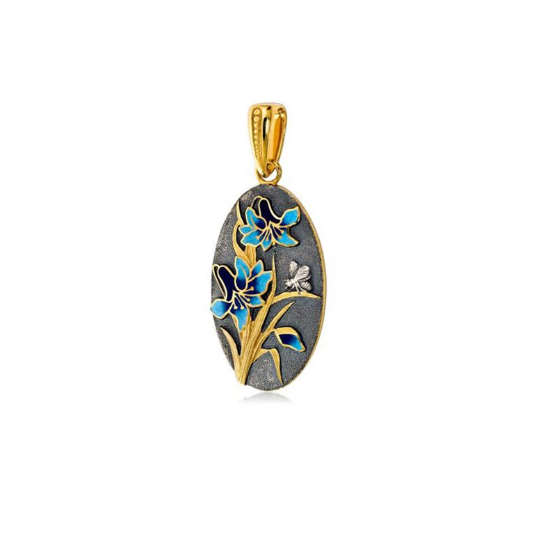 Подвеска «Лилии» выполнена из серебра 925-й пробы с чернением и золочением 999-й пробы по технологии горячего эмалирования.