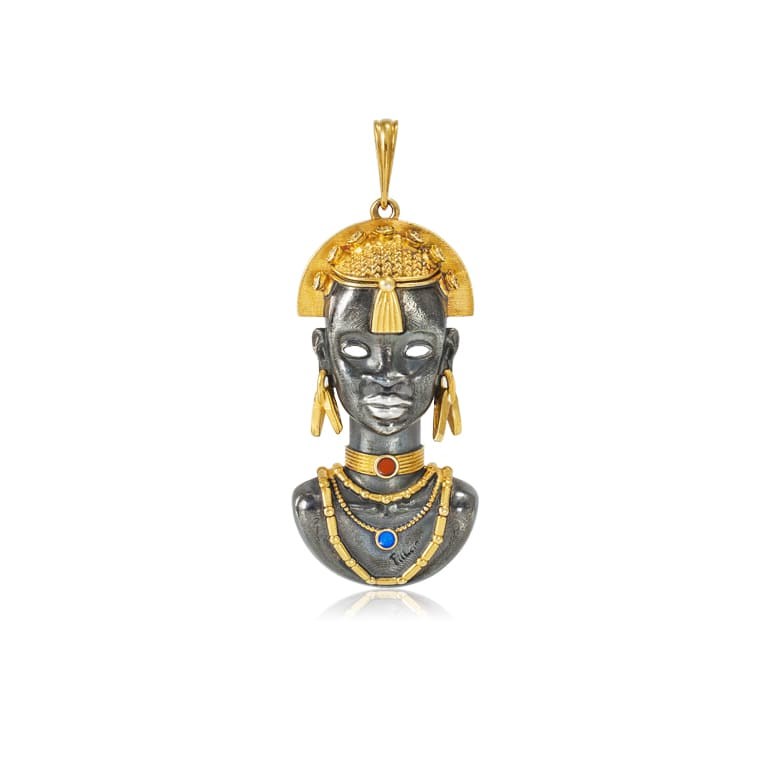 Подвеска «Саванна. Маска Миона» выполнена в серебре 925* с золочением 999* по технологии горячего эмалирования.