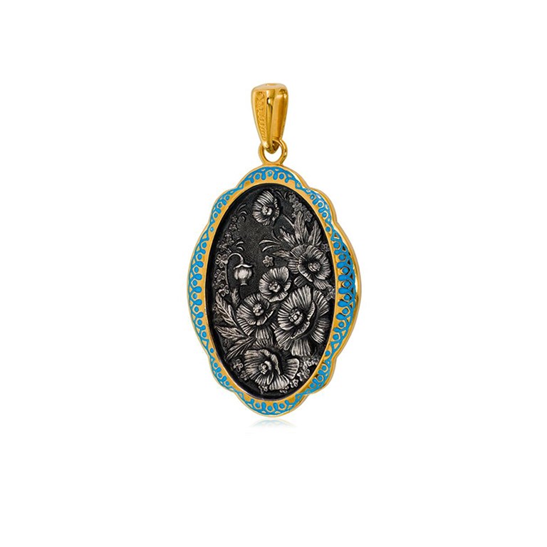 Подвеска выполнена из серебра 925-й пробы с чернением, покрыта золочением 999-й пробы по технологии горячего эмалирования.