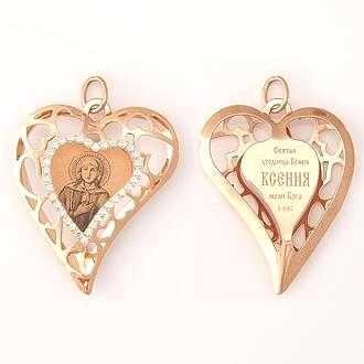 Это православное изделие - Подвеска выполнено из золота 585 пробы. Подвеска имеет вставки из фианита в количестве 28 шт.Подвеска имеет нанесённый лик - Святая Ксения. Изделие входит в коллекцию "Золотой ажур".