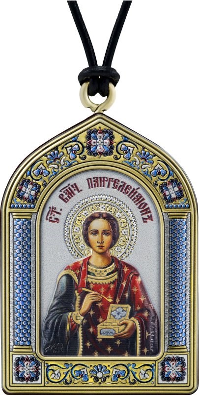 На этой иконе святой изображён с ларцом для врачебных снадобий и ложечкой в руках — древний символ его служения. Оклад украшен цветной эмалью, мягкой по цвету, но яркой в деталях. Арочная форма, чёрный шнур — икону можно носить с собой или повесить у изголовья, в машине, рядом с рабочим местом.