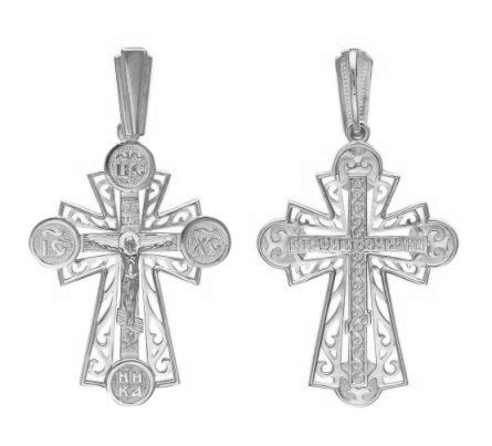 Это освященное православное изделие - Крест из серебра 925 пробы. Имеет вставки из корундов. Цвета камней представлены в ассортименте. Если хотите конкретный цвет, то уточните возможность его выбора у менеджера при заказе. Имеет нанесенную молитву Спаси и сохрани. Изделие входит в коллекцию Аксиос. Весит, от 3.15 гр.