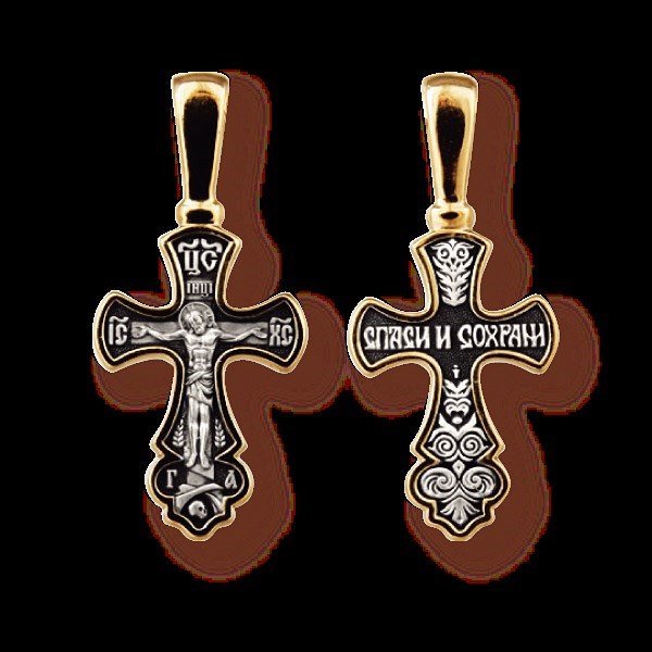 Крест серебрянный, Позолота желтая 999* Чернение (оксидирование), с корундами, Спаси и сохрани, коллекция "Санкт-Петербург", 2.52 гр., арт. 225218
