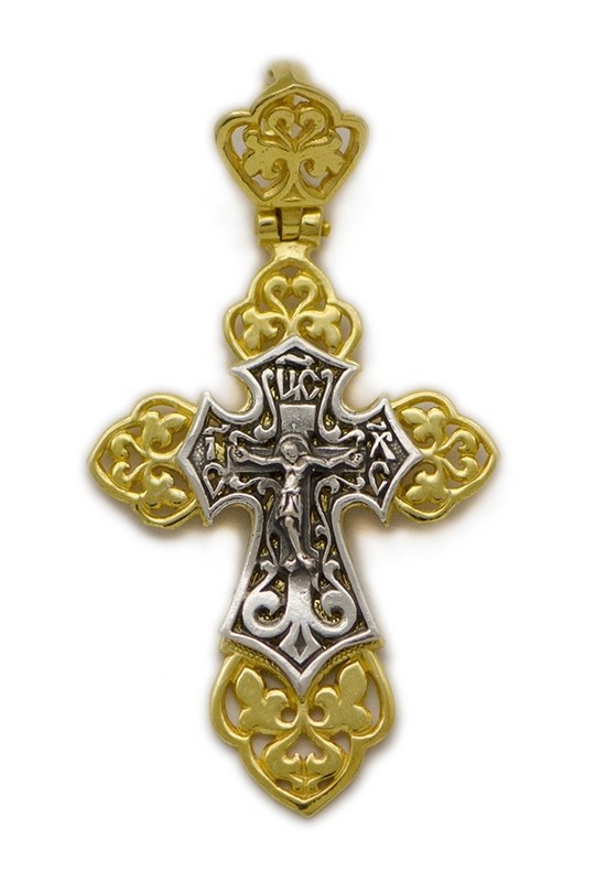 Это освященное православное изделие - Крест из серебра 925 пробы. Произведено по типу литье.На нем нанесено покрытие: Позолота красная 585* . Имеет вставки из корундов. Цвета камней представлены в ассортименте. Если хотите конкретный цвет, то уточните возможность его выбора у менеджера при заказе. Имеет нанесенную молитву Спаси и сохрани. Изделие входит в коллекцию Духовное наследие. Весит, от 3.39 гр.