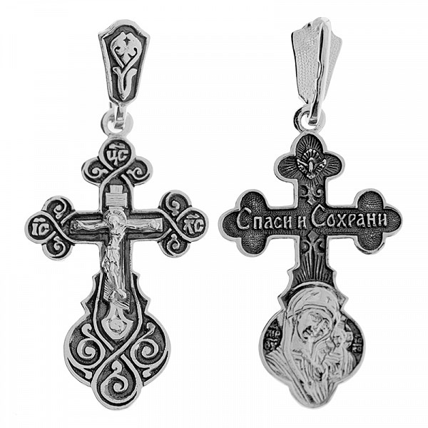 Крест серебрянный, Родий, с корундами, Казанская Божья Матерь, Спаси и сохрани, Спаси и сохрани, 4.03 гр., арт. ПР.К.000006