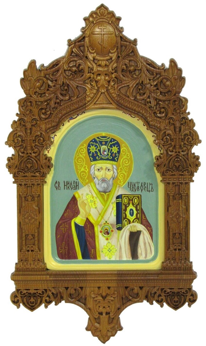 Икона Николая Чудотворца - одна из самых почитаемых. Святителя Николая (ок. 270 — ок. 345) называют также Николай Угодник и Николай Чудотворец. Это христианский святой, архиепископ Мир Ликийских в Византии. Его почитают как чудотворца, покровителя моряков, купцов и детей. Святому Николаю молятся об исцелении, помощи в разных бедах, о добрых отношениях в семье, благополучии в пути, молятся за детей, о защите вдов и сирот, о благополучном плавании, о помощи в бедности и нужде, от грусти и уныния. Ещё при жизни святитель Николай Чудотворец прославился как защитник невинно осуждённых, умиротворитель враждующих и избавитель от напрасной смерти. Икона выполнена на натуральной деревянной доске, изготовленной из массива сакрального кипариса. На теле иконы выбран двойной ковчег арочной формы. Образ написан вручную художницей "Мастерской РАЗДОЛЬЕ" Татьяной Угодиной. Венец иконы вручную украшен неповторимым фантазийным орнаментом. К каждой иконе прилагается номерное свидетельство с полной информацией о ней. Каждая икона поставляется в резном киоте из массива мореного ясеня со стеклом. Киот, в свою очередь, уложен в пенал из березовой фанеры и упакован в картонную транспортную коробку.